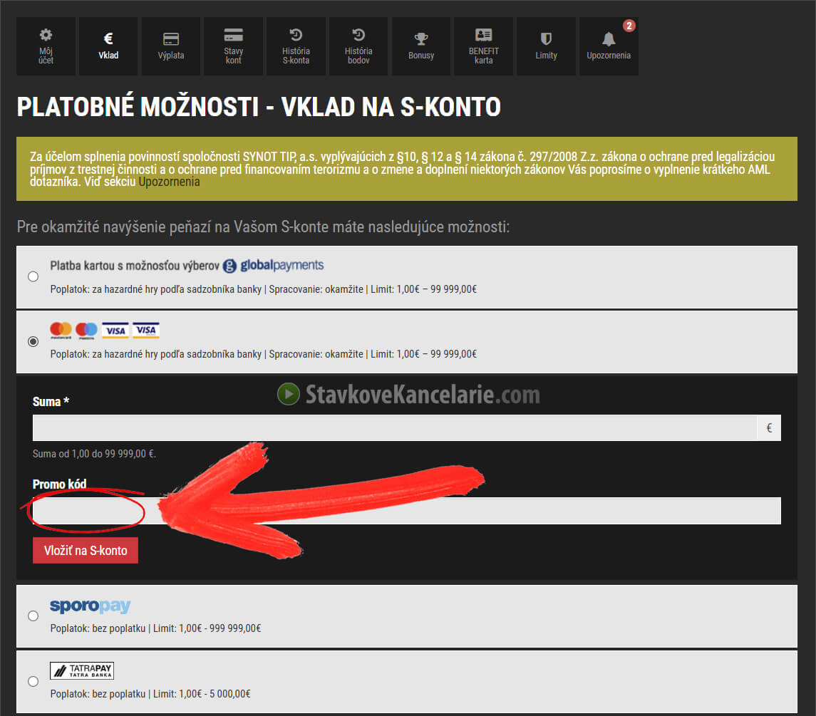 Druhou možnosťou je vložiť v stávkovej kancelárii SynotTip bonusový kód do poľa „Promo kód“ pri vklade na S-konto (hráčsky účet).
