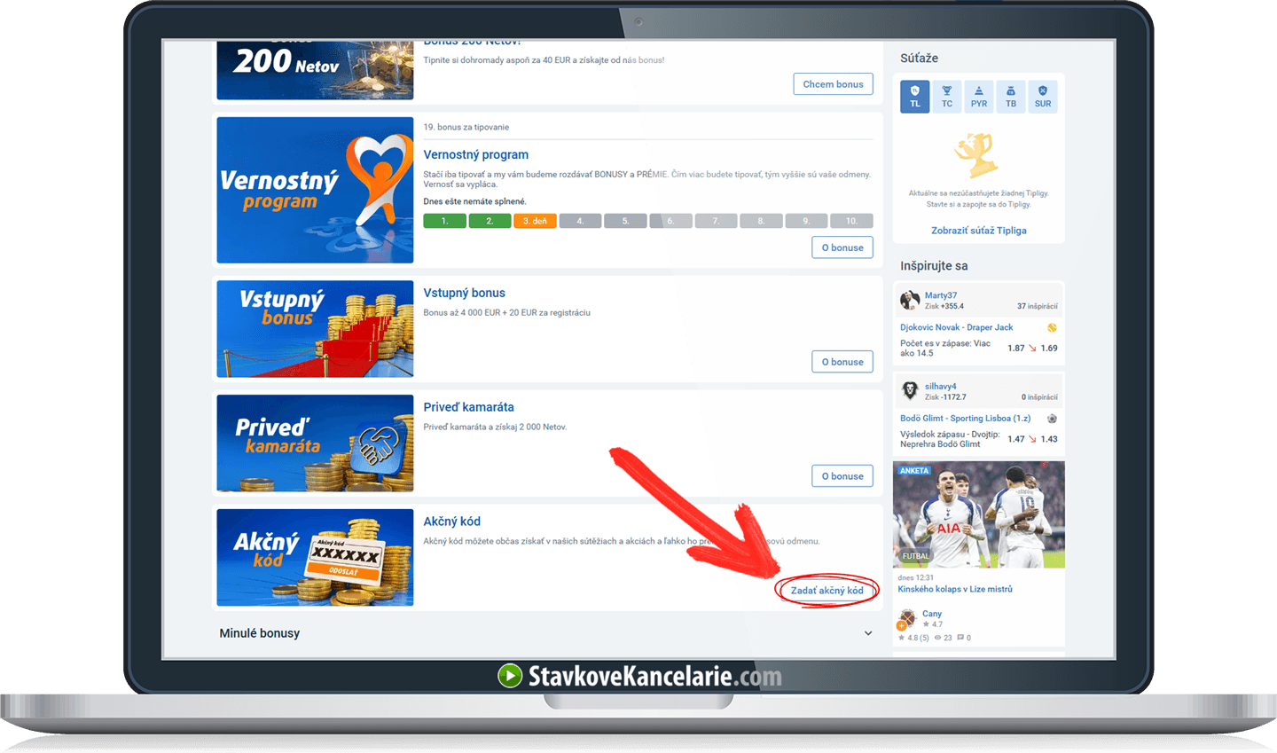- Vloženie akčného kódu – Kde zadať akčný kód v Tipsporte