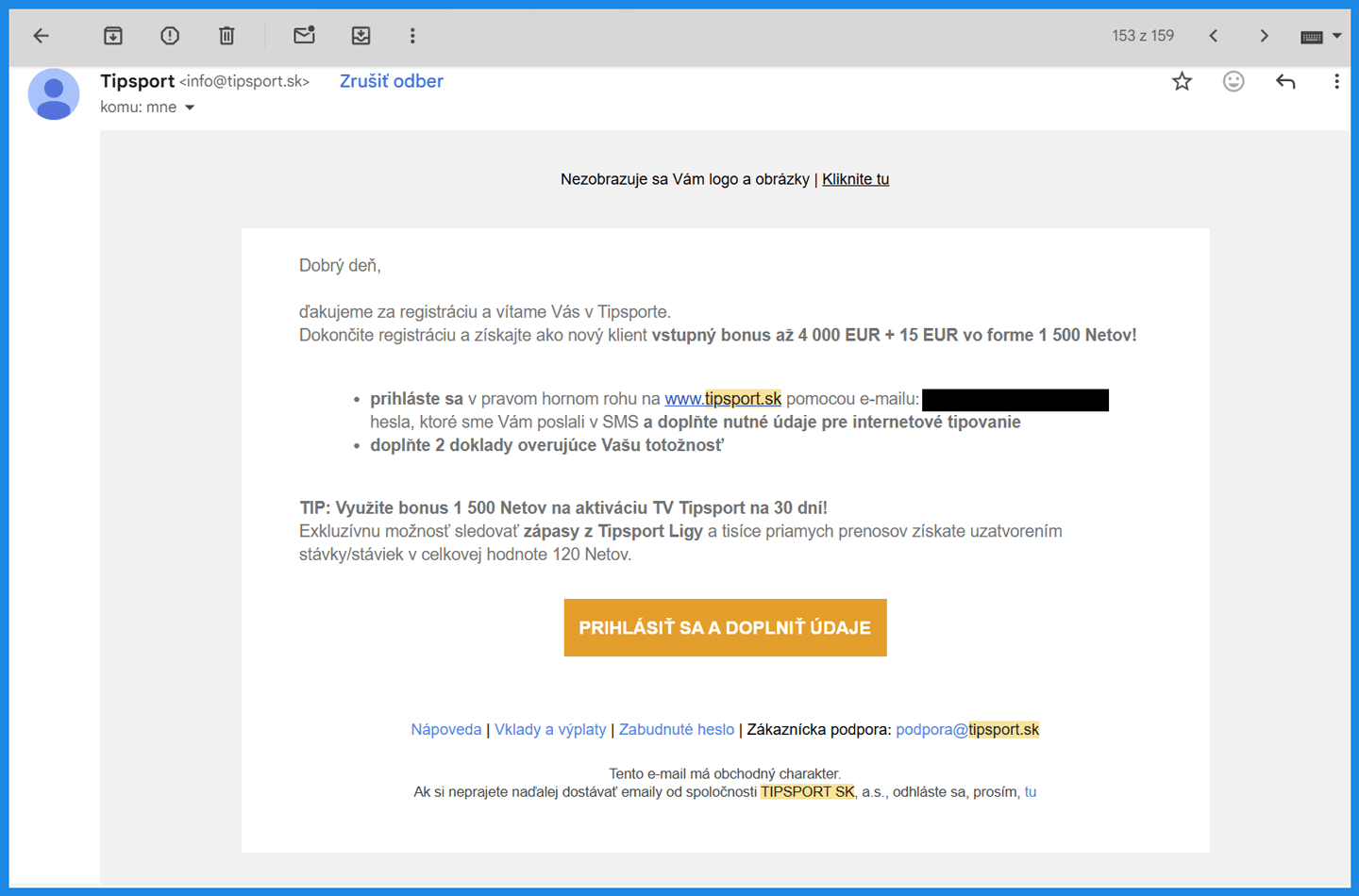 - Po registrácii a overení totožnosti nám prepošlite e-mail od stávkovej kancelárie Tipsport (e-mail po overení účtu) na .